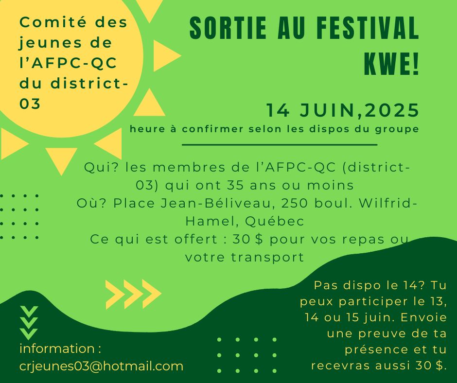Le comité des jeunes de l’AFPC-Québec du district 3 invite les membres de 35 ans et moins à une sortie au Festival KWE! À la rencontre des personnes autochtones qui aura lieu le samedi 14 juin 2025 à la Place Jean-Béliveau (250, boulevard Wilfrid-Hamel, Québec G1L 5A7).