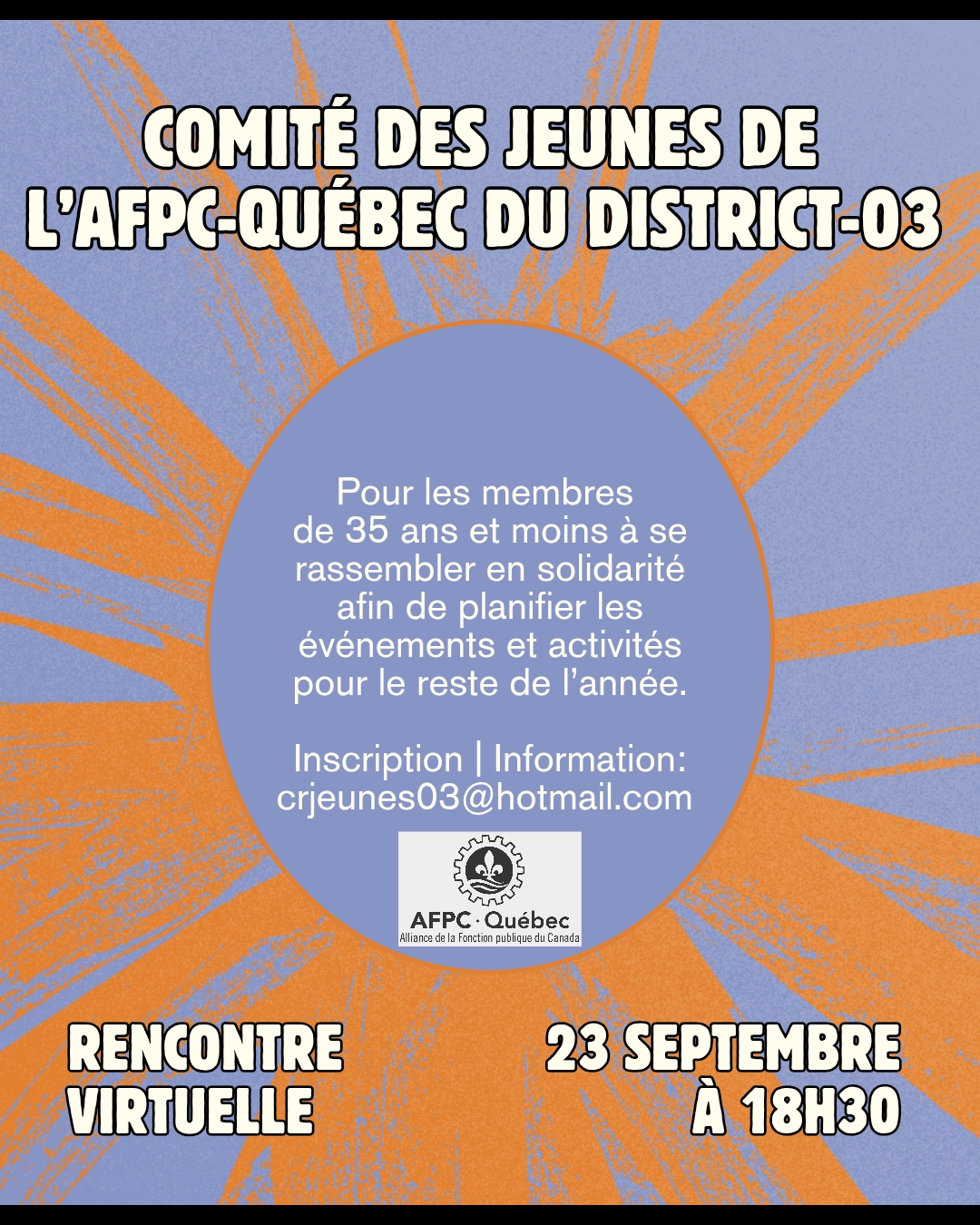 Le Comité des jeunes du district 3 de l’AFPC-Québec vous invite à sa prochaine rencontre virtuelle qui aura lieu le mardi 23 septembre 2025 à 18 h 30.