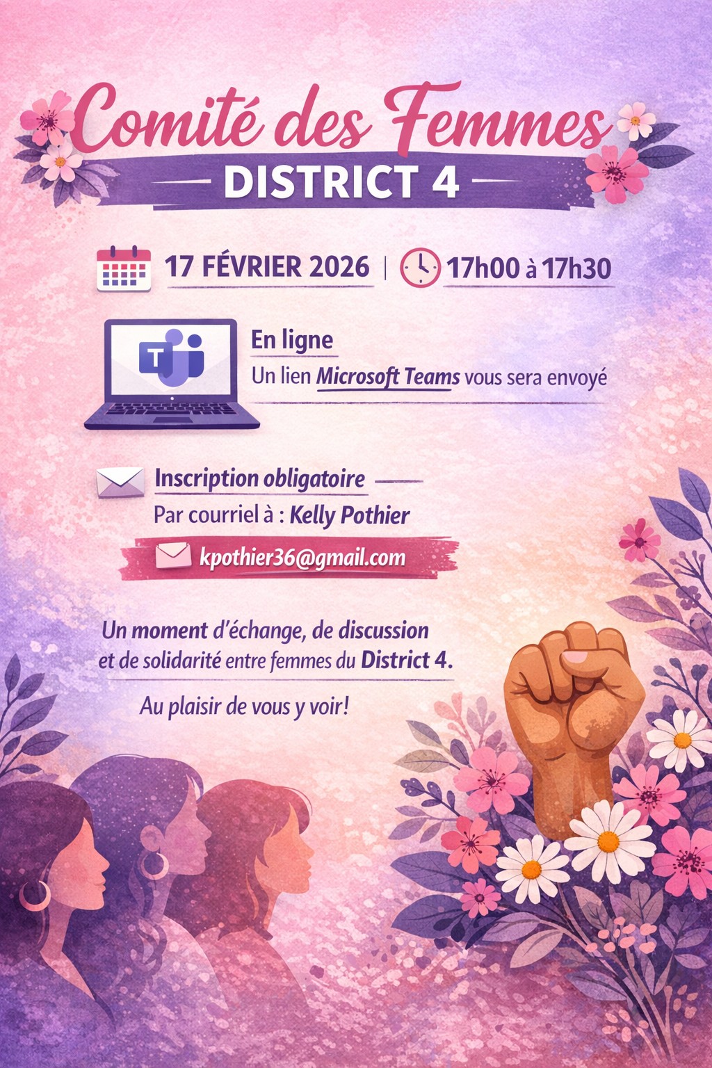 Nous avons le plaisir de vous inviter à la prochaine rencontre du Comité des femmes du District 4, qui se tiendra en virtuel le mardi 17 février 2026, de 17h à 17h30.
